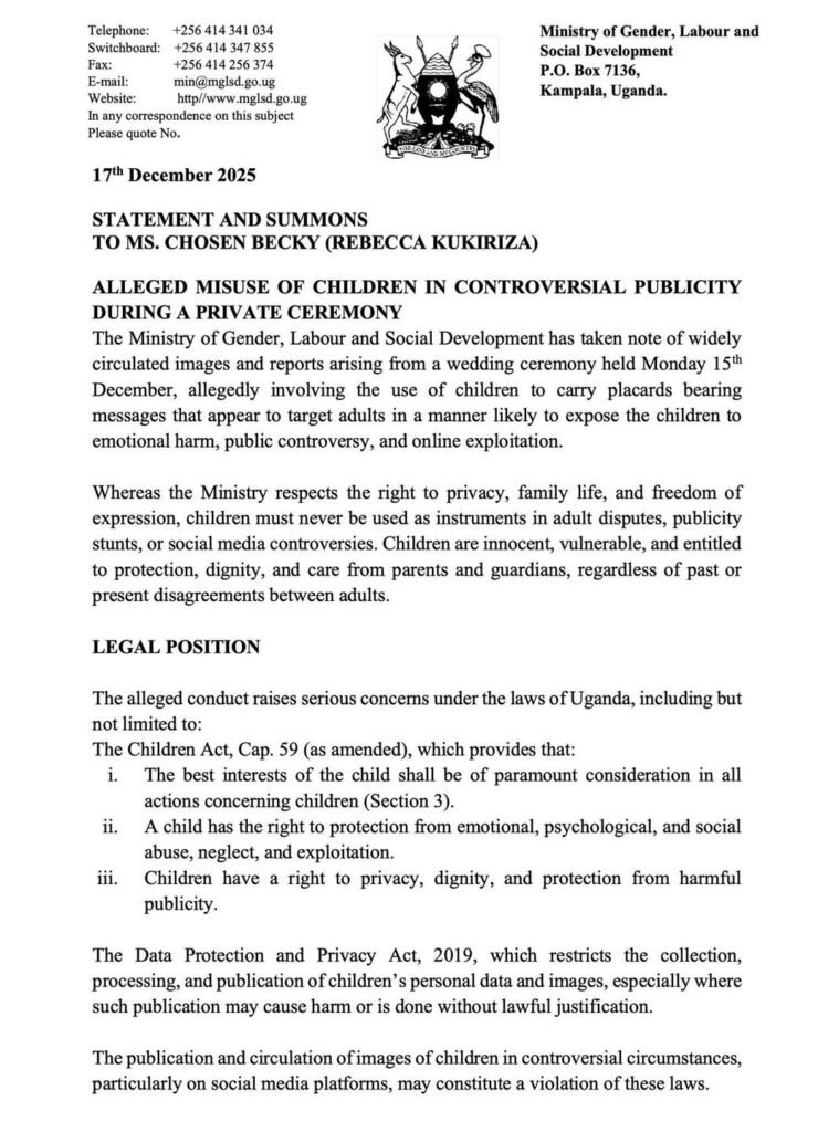 Olunaku lweggulo nga 16 December , Omuyimbi Chosen Becky yakawangamudde bweyakwasizza abaana be ebipande nga biwandiikiddwako obubaka obwatabudde banna Uganda n’abalala nga bulumba obufumbo bweyavaamu, ekyogeddwako ennyo ng’ekinaakosa abaana bano nga bakuze.