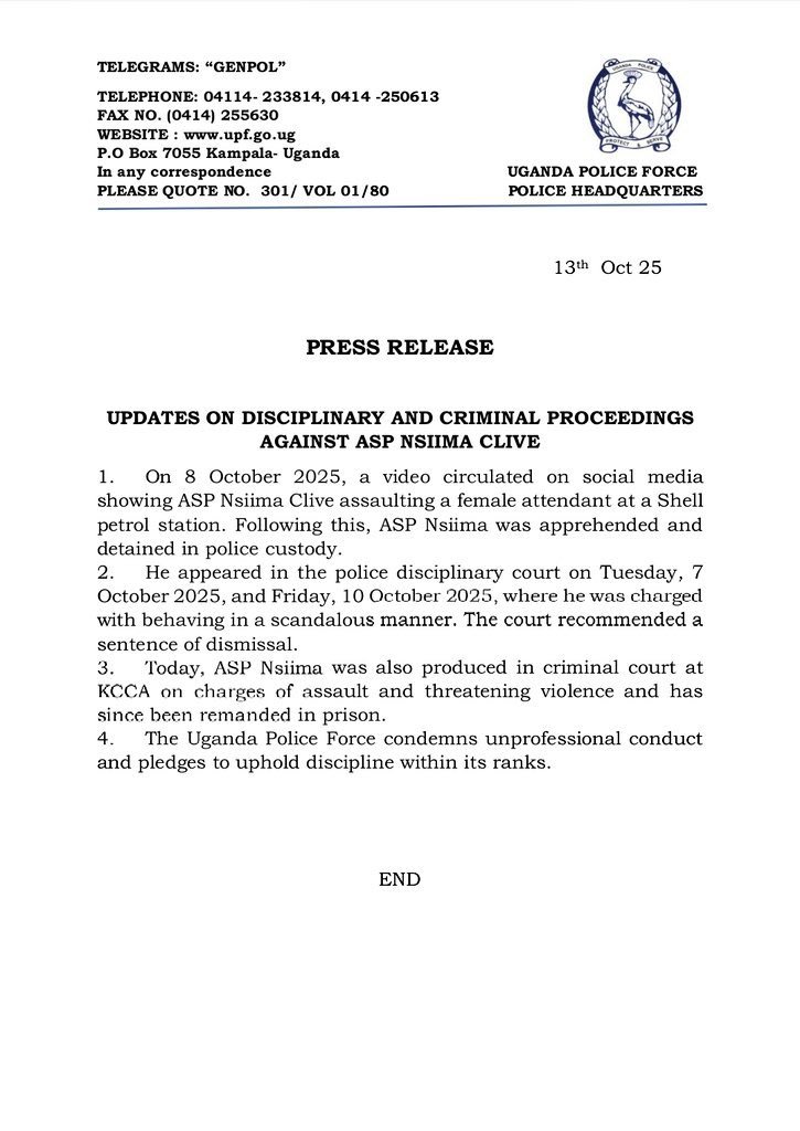 Okusinziira ku bubaka obuteereddwa ku mikutu gya Poliisi emigattabantu, Nsiima yagasimbaganye n’akakiiko akakwasisa empisa mu Poliisi okwenyonnyolako ku ffujjo lyeyakola okukkakkana nga kamusingisizza omusango era nekawabula nti asaana kuwummuzibwa ku mulimu. Ono mu kakiiko kano yagendayo Ssabbiiti ewedde .