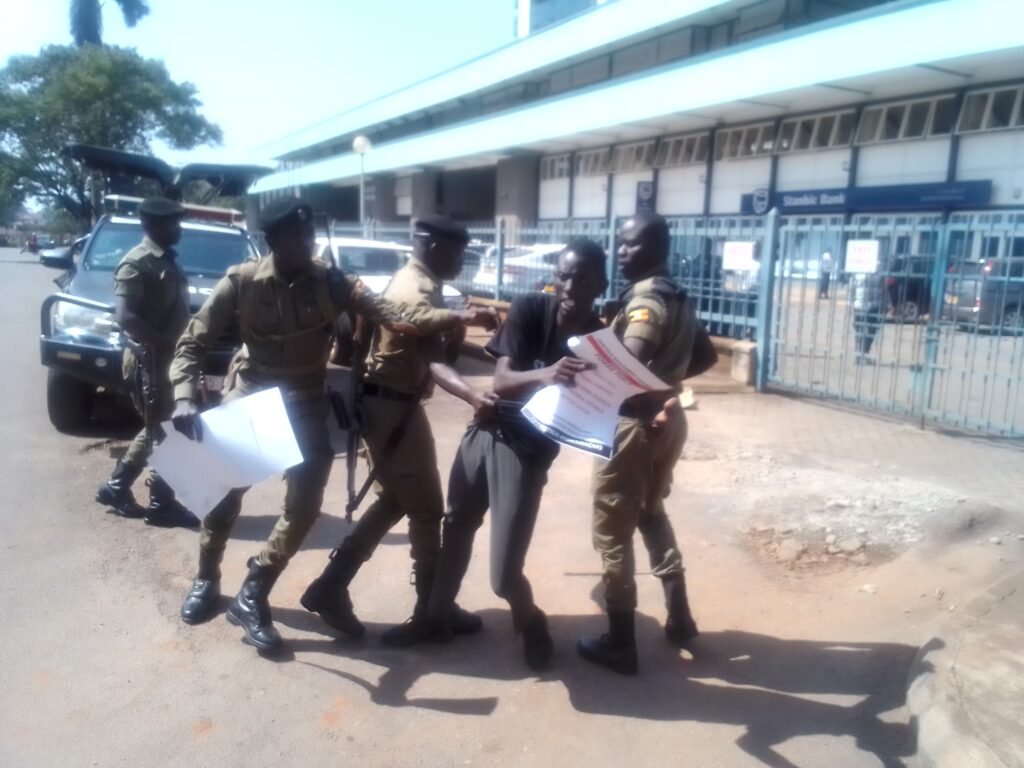 Poliisi ekutte bannakibiina kya Justice Movement Uganda babiri nga bagezaako okutambula okugenda mu ofiisi z’omukago gwa Bulaaya mu Kampala nga bawakanya okuzimba omudumu gw’amafuta agatali malongoose mu East Africa Eacop.